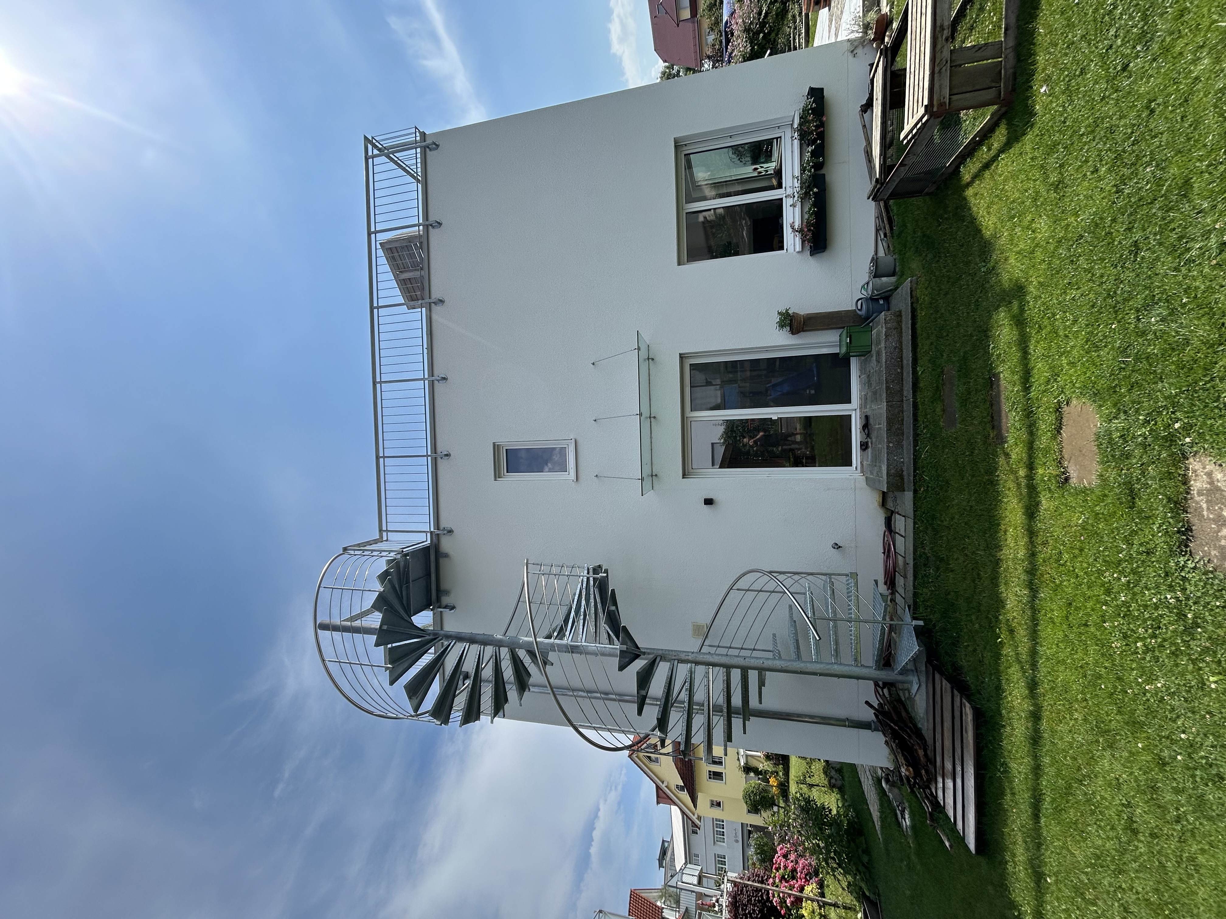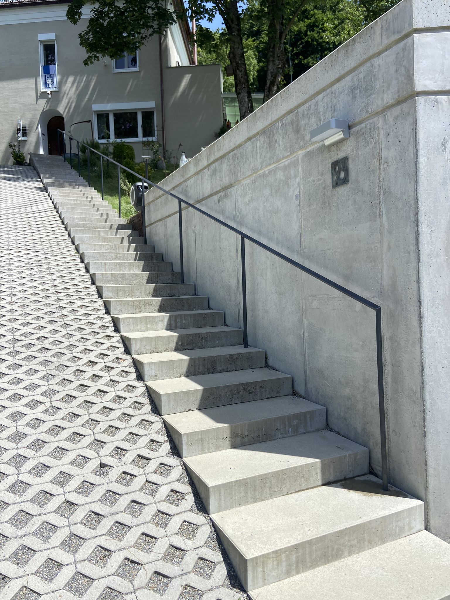 Schlichter Edelstahlhandlauf rundet das Objekt ab.