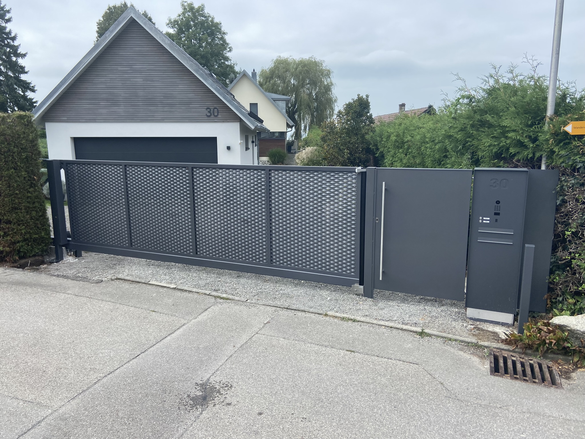 Hoftor mit elektrischen Antrieb, Briefkasten mit Klingel und Sprechanlage, Seitentür, alles aus dem Hause Zwisler